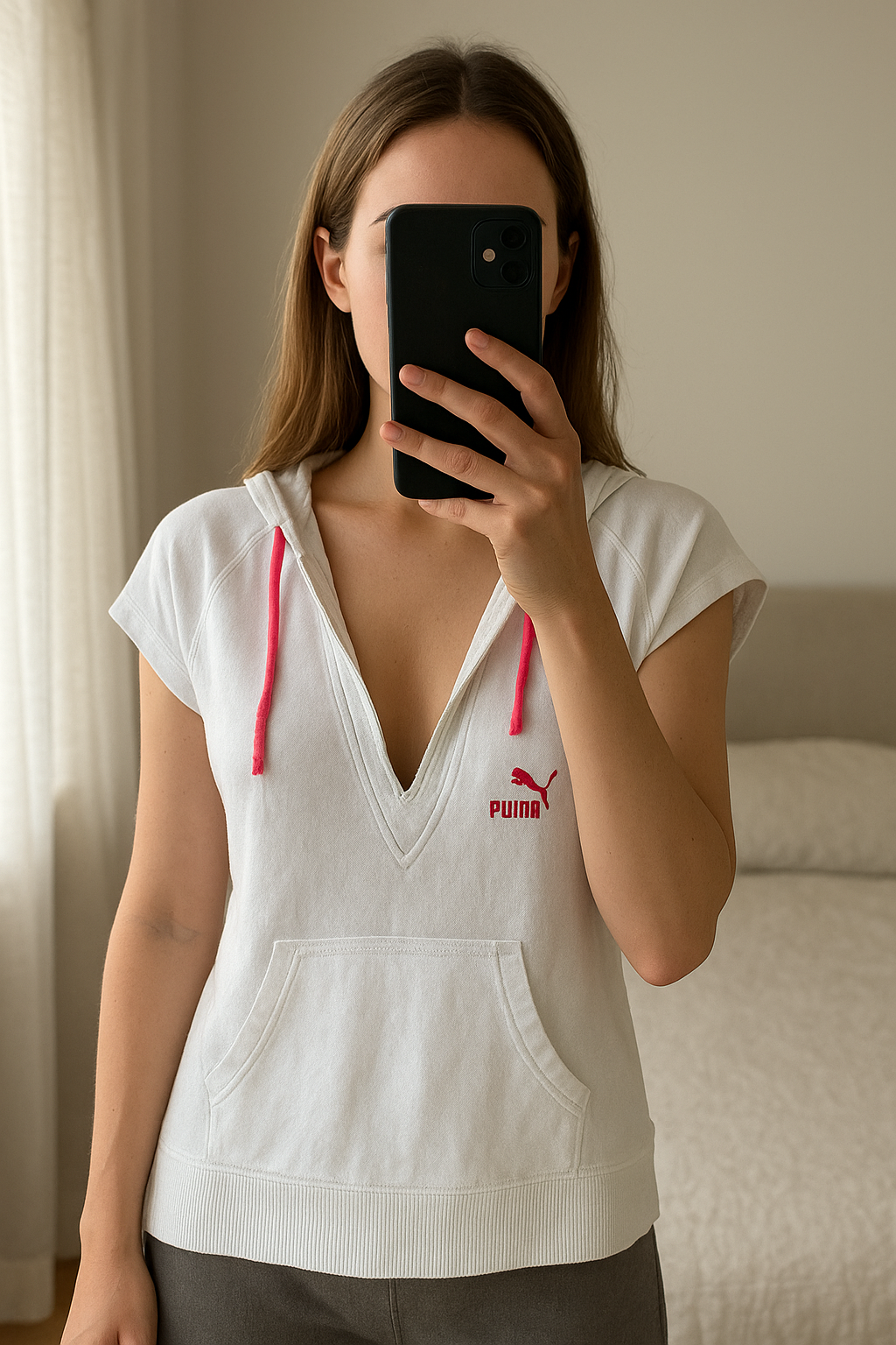 Puma valkoinen lyhythihainen hupullinen neulepusero, koko 38 standing straight facing the camera, in a softly lit bedroom setting, with gentle natural light filtering through a window.