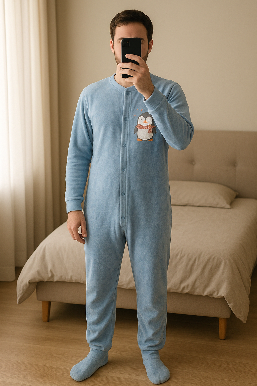 Pyjama bébé garçon 6 mois debout, face à la caméra, dans une chambre à la lumière douce, avec une lumière naturelle filtrant par la fenêtre.