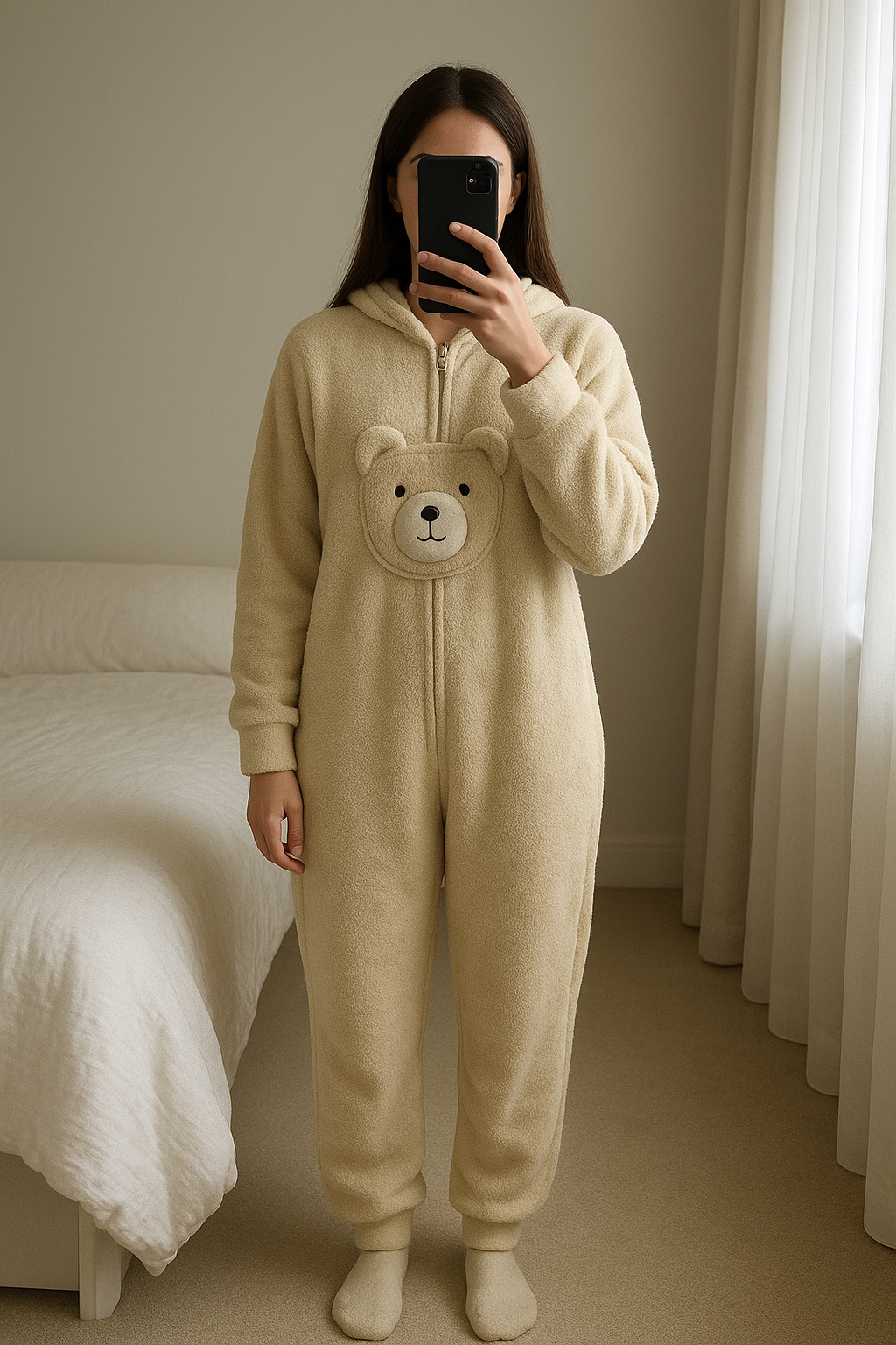 Pyjama Combi debout, face à la caméra, dans une chambre à la lumière douce, avec une lumière naturelle filtrant par la fenêtre.