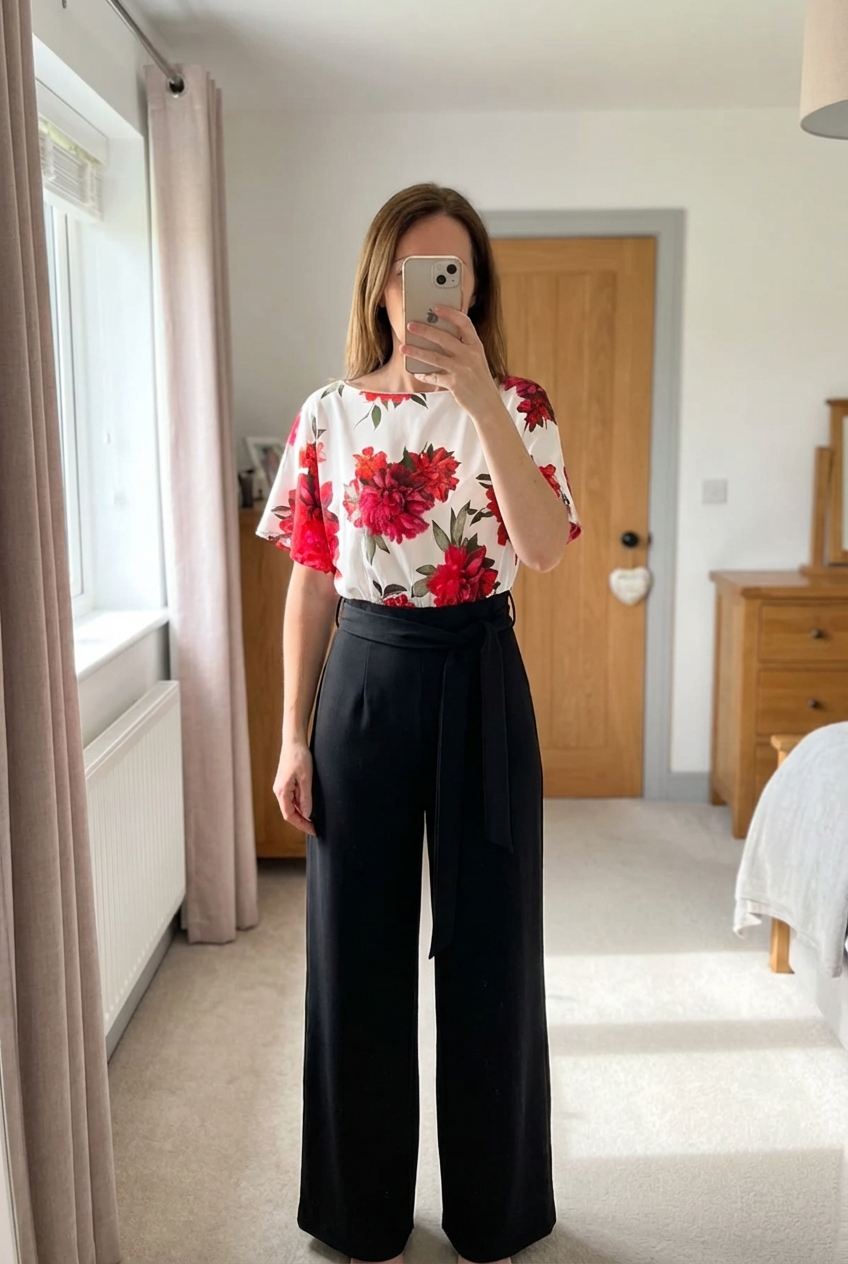 Quiz jumpsuit standing straight facing the camera, in a softly lit bedroom setting, with gentle natural light filtering through a window.