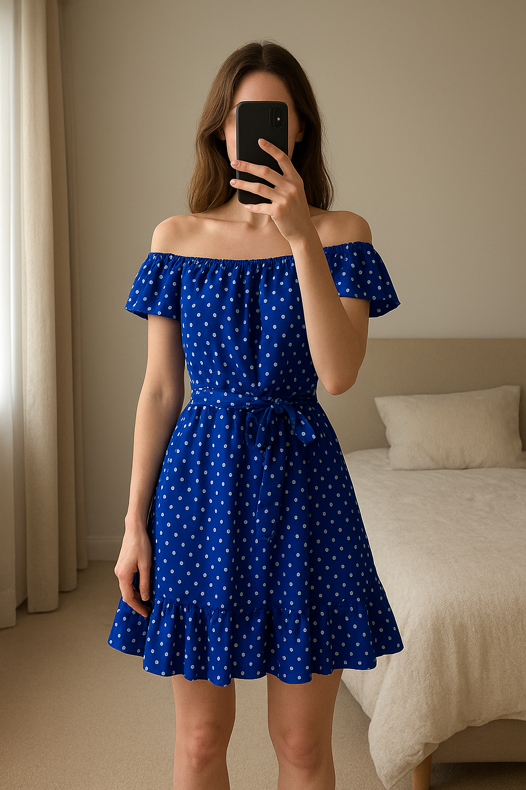 Quiz play suit standing straight facing the camera, in a softly lit bedroom setting, with gentle natural light filtering through a window.