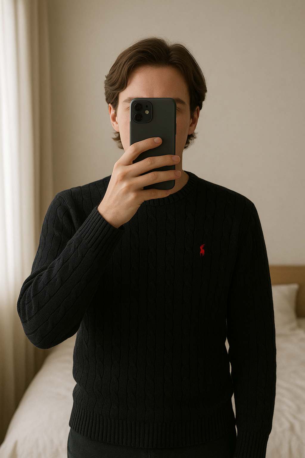 Ralph Lauren Cable Knit Jumper | S standing straight facing the camera, in a softly lit bedroom setting, with gentle natural light filtering through a window.