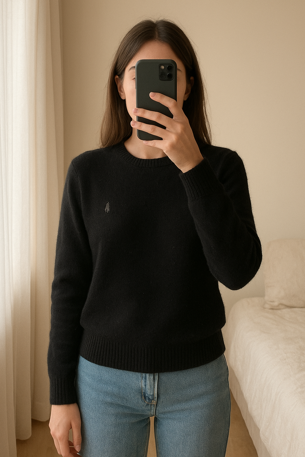 Ralph Lauren Womens pullover standing straight facing the camera, in a softly lit bedroom setting, with gentle natural light filtering through a window.