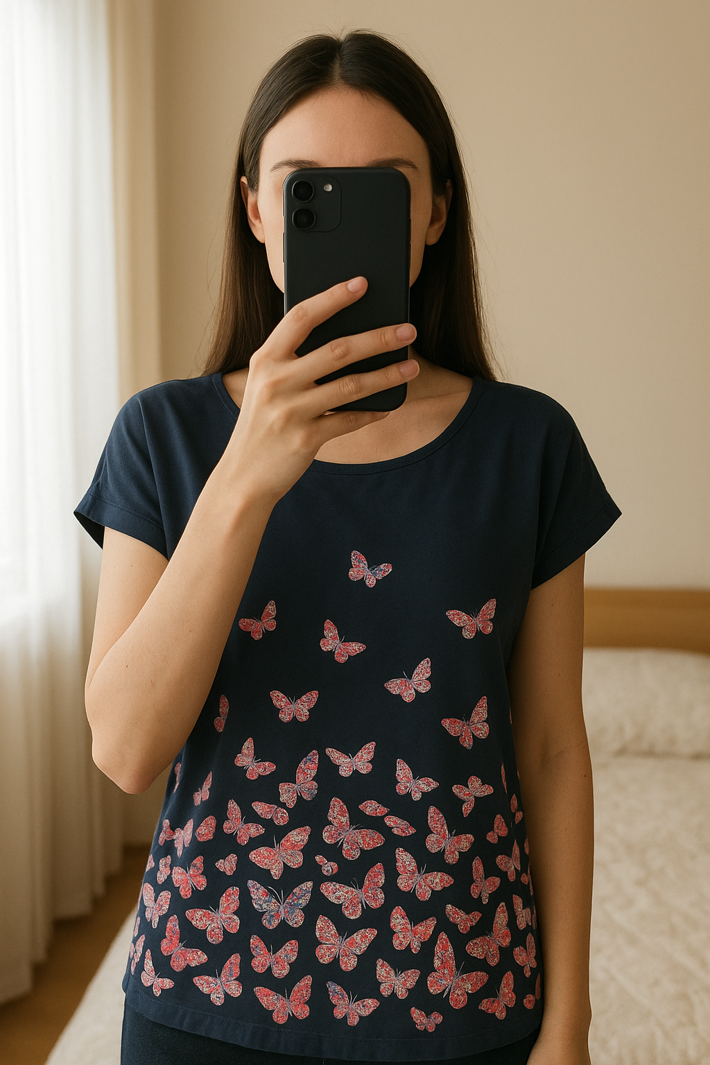 Red Herring size 18 pretty navy butterfly top with sewing detail standing straight facing the camera, in a softly lit bedroom setting, with gentle natural light filtering through a window.
