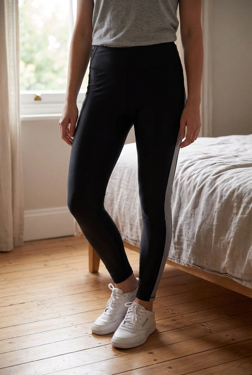 Reebok zwarte legging Shiny small standing straight facing the camera, in a softly lit bedroom setting, with gentle natural light filtering through a window.