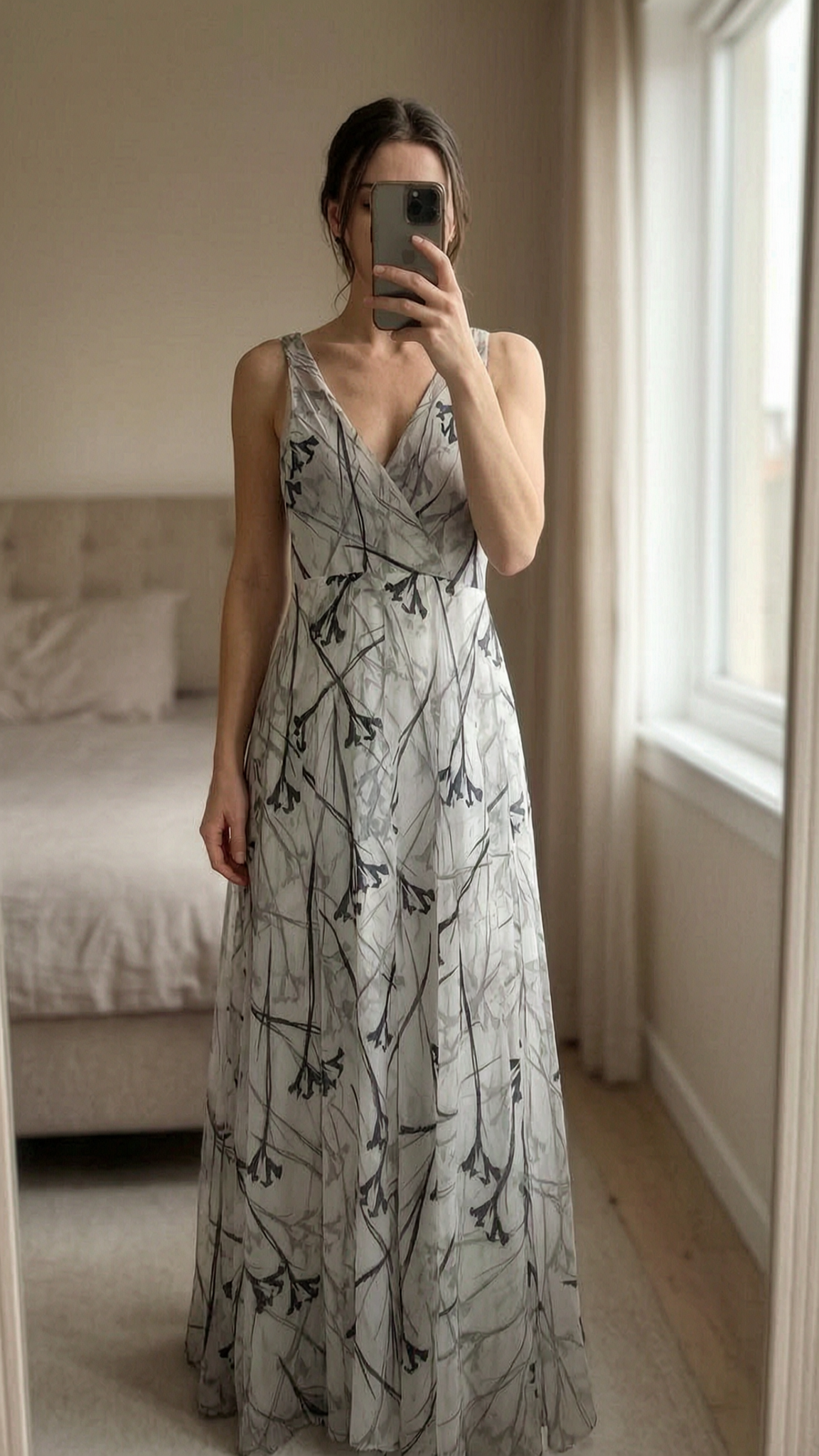 Reiss Floral Maxi Dress - Grey & Black - New without Tag- Size 8 standing straight facing the camera, in a softly lit bedroom setting, with gentle natural light filtering through a window.