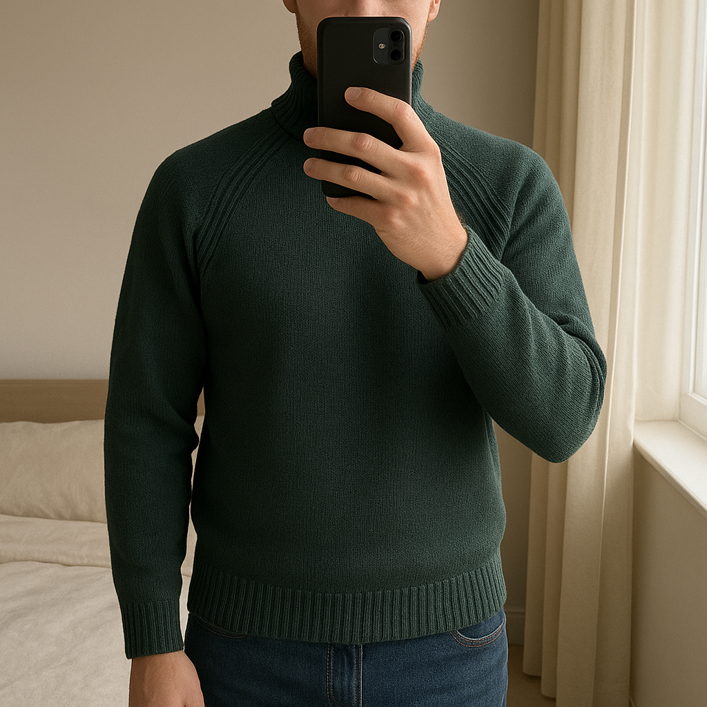 Reiss Men’s Winter Jumper – Size S – New with Tags standing straight facing the camera, in a softly lit bedroom setting, with gentle natural light filtering through a window.