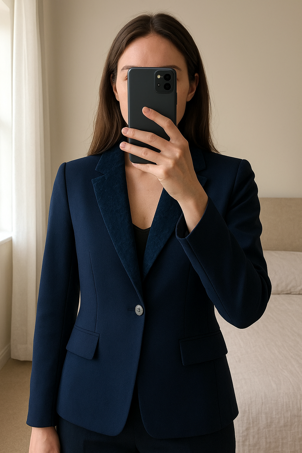 Reiss tailored silhouette wool blazer size 8 standing straight facing the camera, in a softly lit bedroom setting, with gentle natural light filtering through a window.