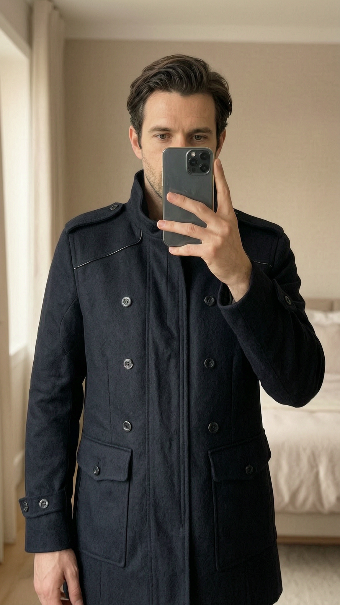 Reiss wool short coat men’s medium standing straight facing the camera, in a softly lit bedroom setting, with gentle natural light filtering through a window.