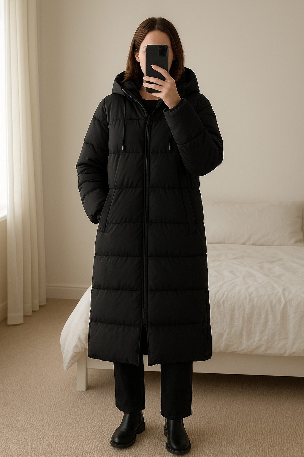 Reserved Steppmantel Winterjacke (wie neu) aufrecht stehend, der Kamera zugewandt, in einem sanft beleuchteten Schlafzimmer, mit natürlichem Licht, das durch ein Fenster fällt.
