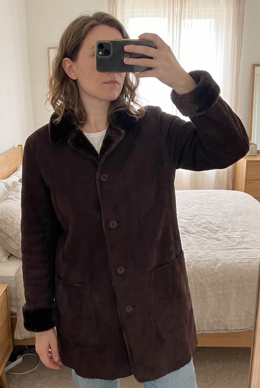 Reversible chocolate faux suede/fur Claudia Sträter 3/4 length coat standing straight facing the camera, in a softly lit bedroom setting, with gentle natural light filtering through a window.