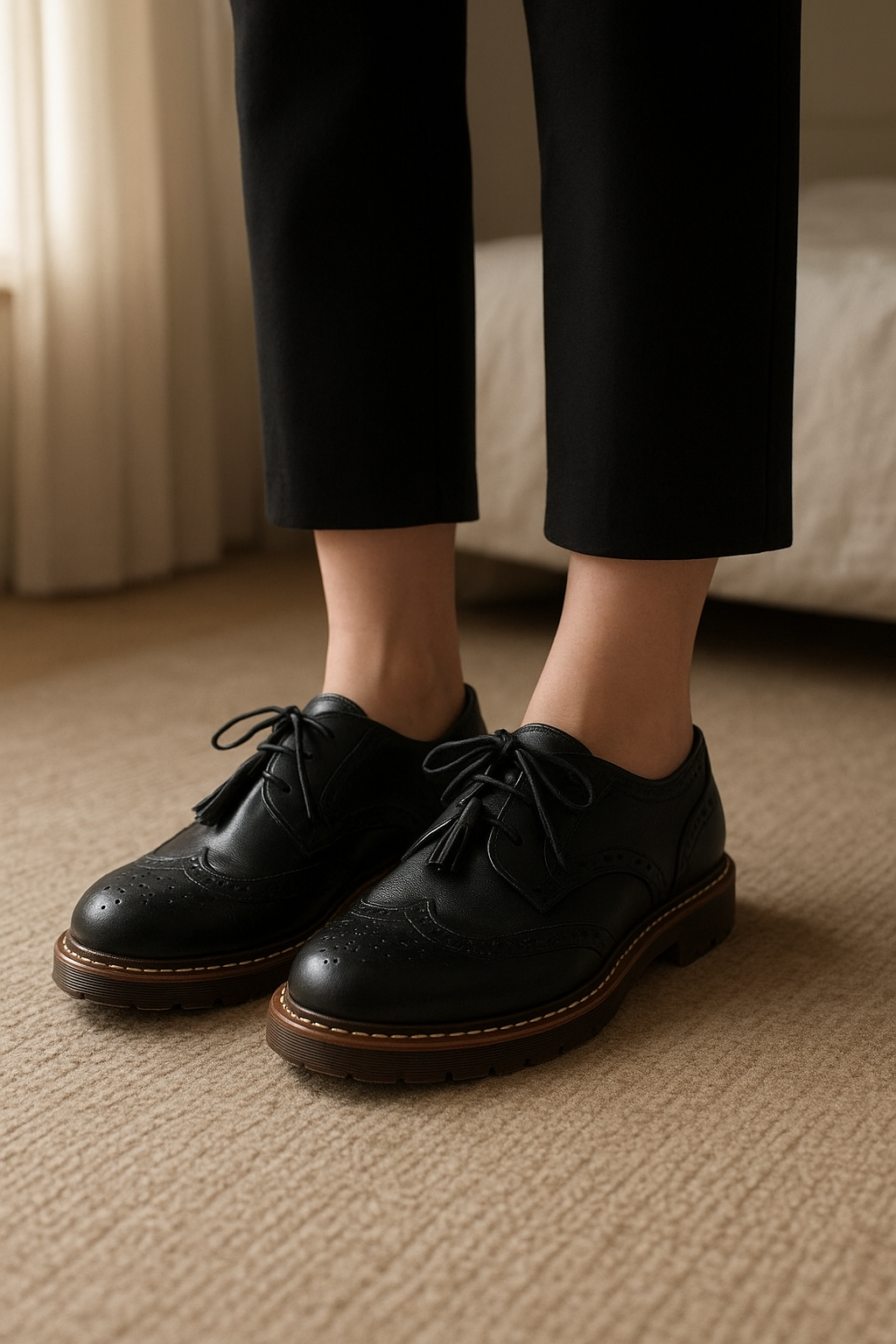 richelieu pour femme Cink-Me T40 Bleu Noir debout, face à la caméra, dans une chambre à la lumière douce, avec une lumière naturelle filtrant par la fenêtre.
