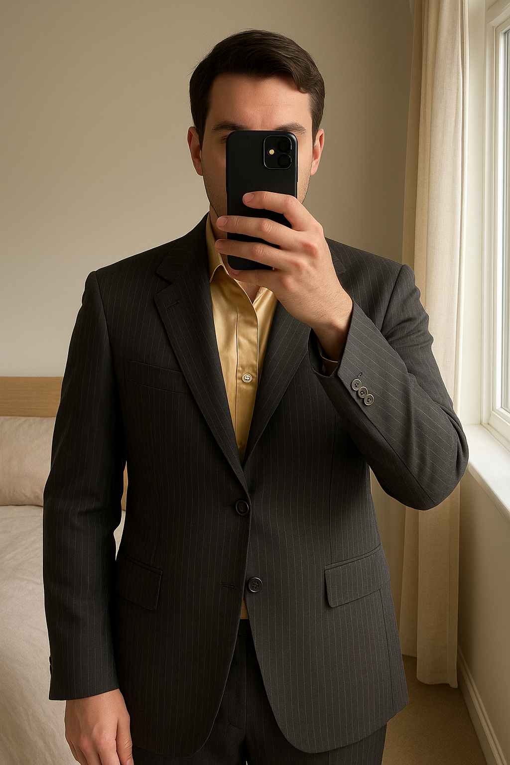 River Island suit jacket standing straight facing the camera, in a softly lit bedroom setting, with gentle natural light filtering through a window.