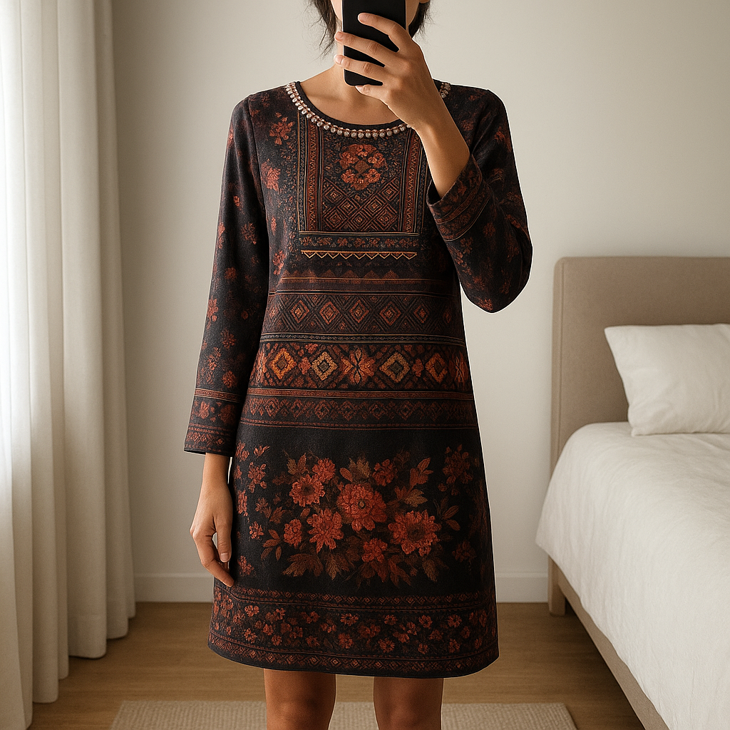 Une personne en Robe 1001 idées debout, face à la caméra, avec une silhouette fine, dans une chambre à la lumière douce, avec une lumière naturelle filtrant par la fenêtre.