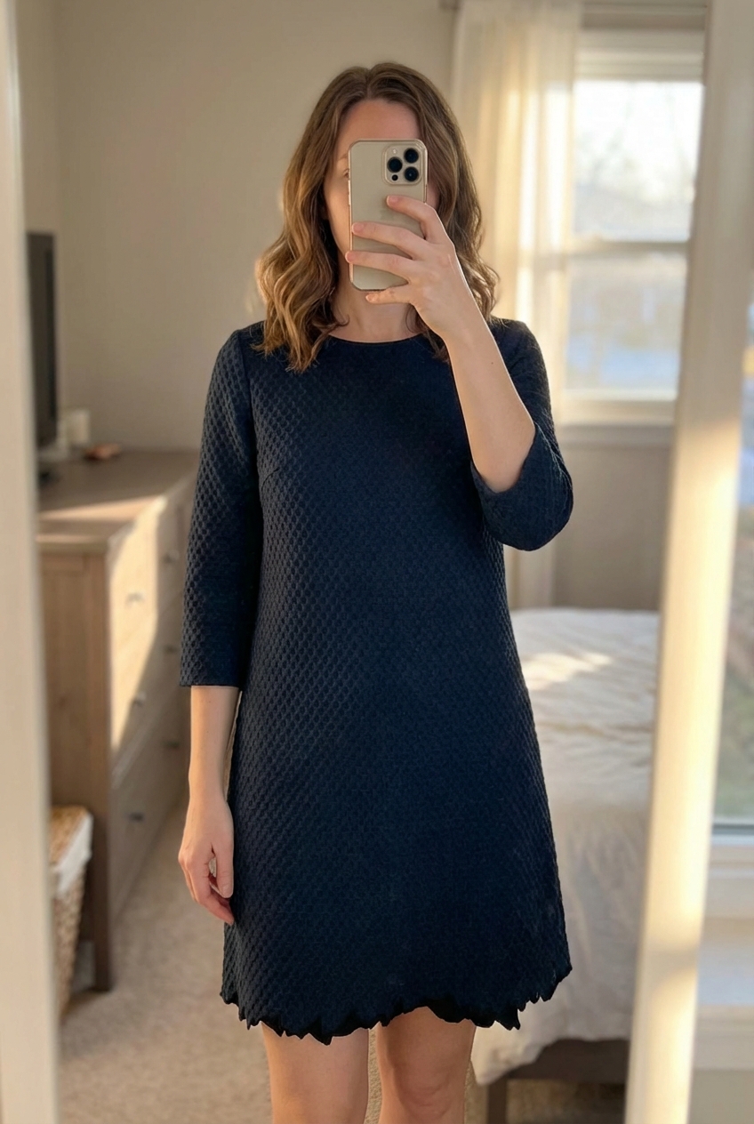 Robe agrafe debout, face à la caméra, dans une chambre à la lumière douce, avec une lumière naturelle filtrant par la fenêtre.