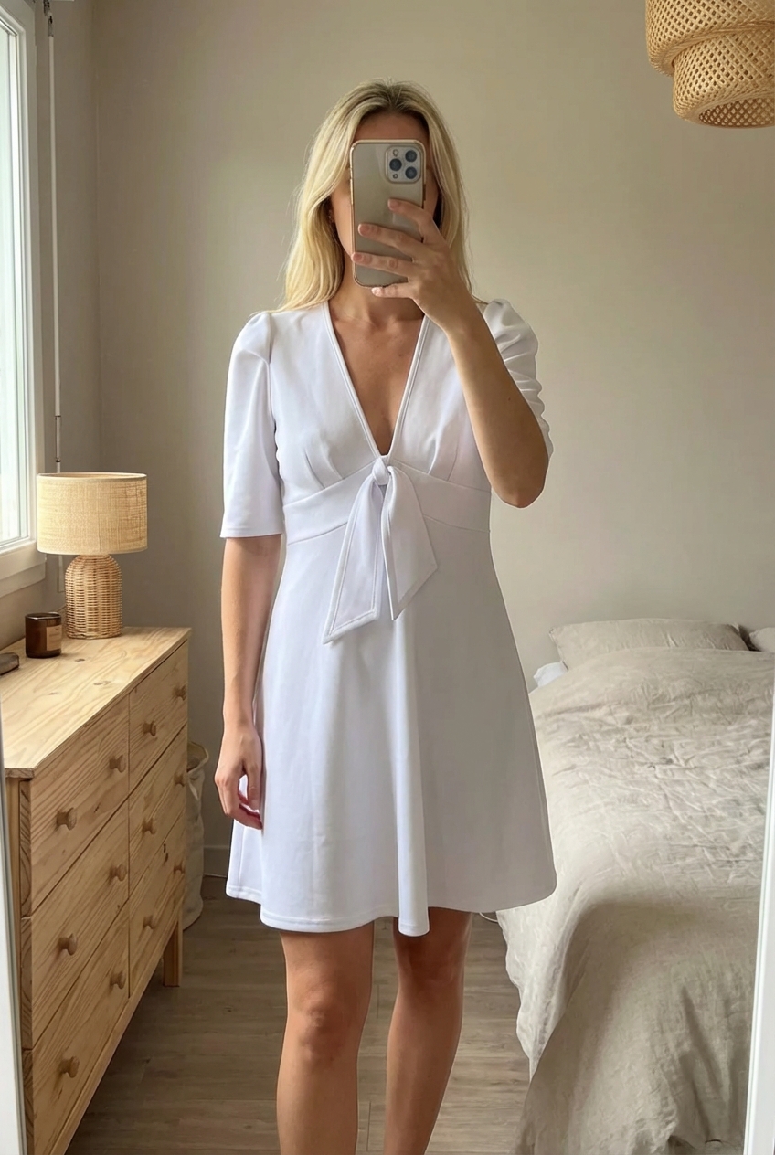 Robe blanche doublée debout, face à la caméra, dans une chambre à la lumière douce, avec une lumière naturelle filtrant par la fenêtre.