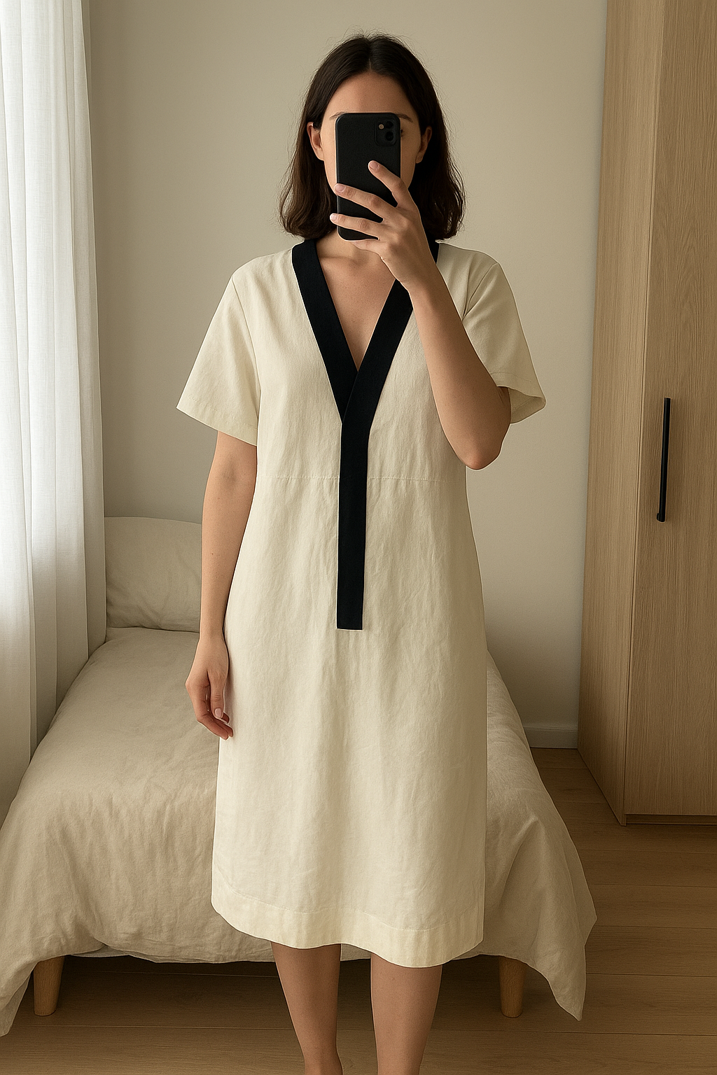 Robe blanche et noire Sandro taille 2 neuve debout, face à la caméra, dans une chambre à la lumière douce, avec une lumière naturelle filtrant par la fenêtre.