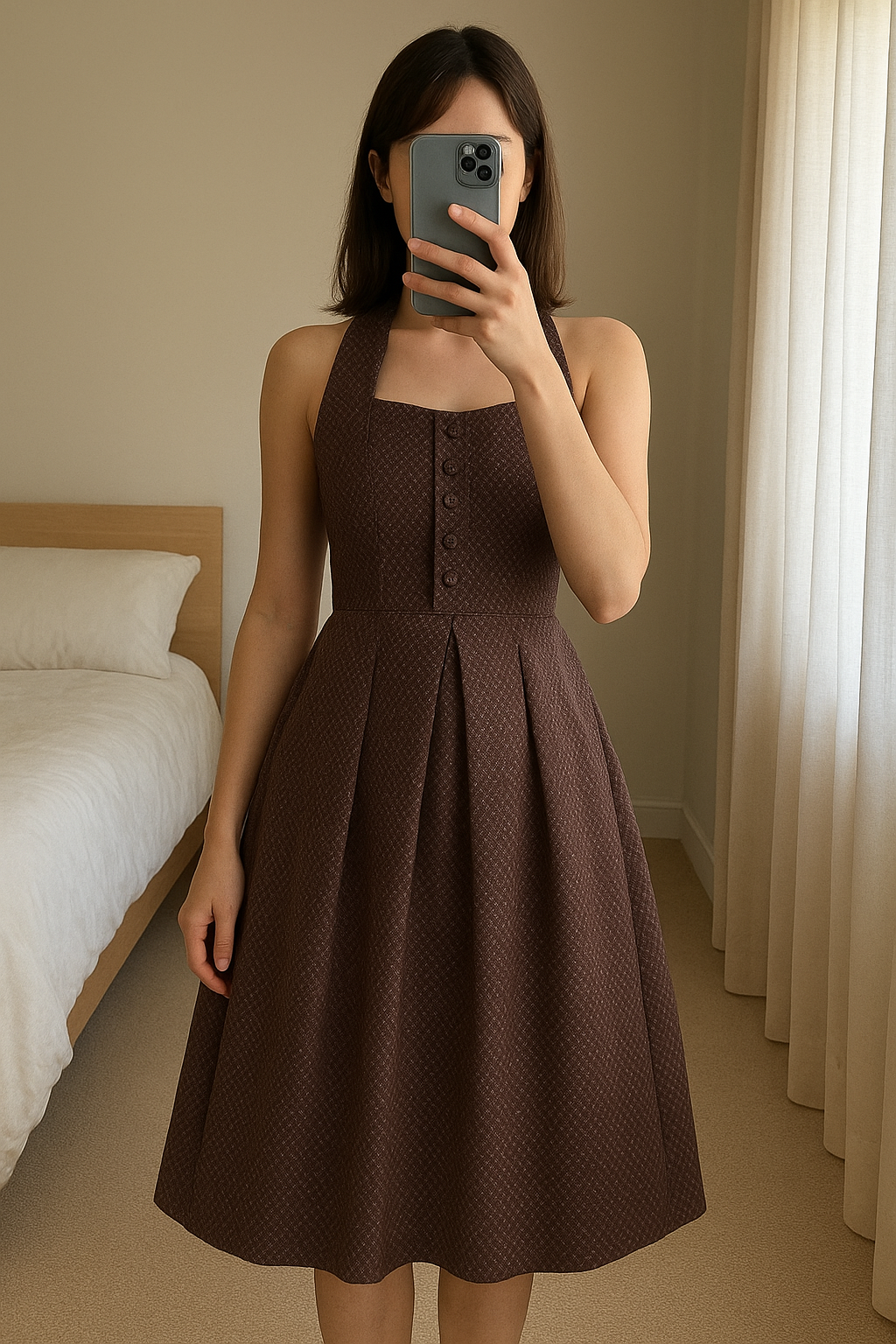 Robe boule rose violet 34 George Rech debout, face à la caméra, dans une chambre à la lumière douce, avec une lumière naturelle filtrant par la fenêtre.