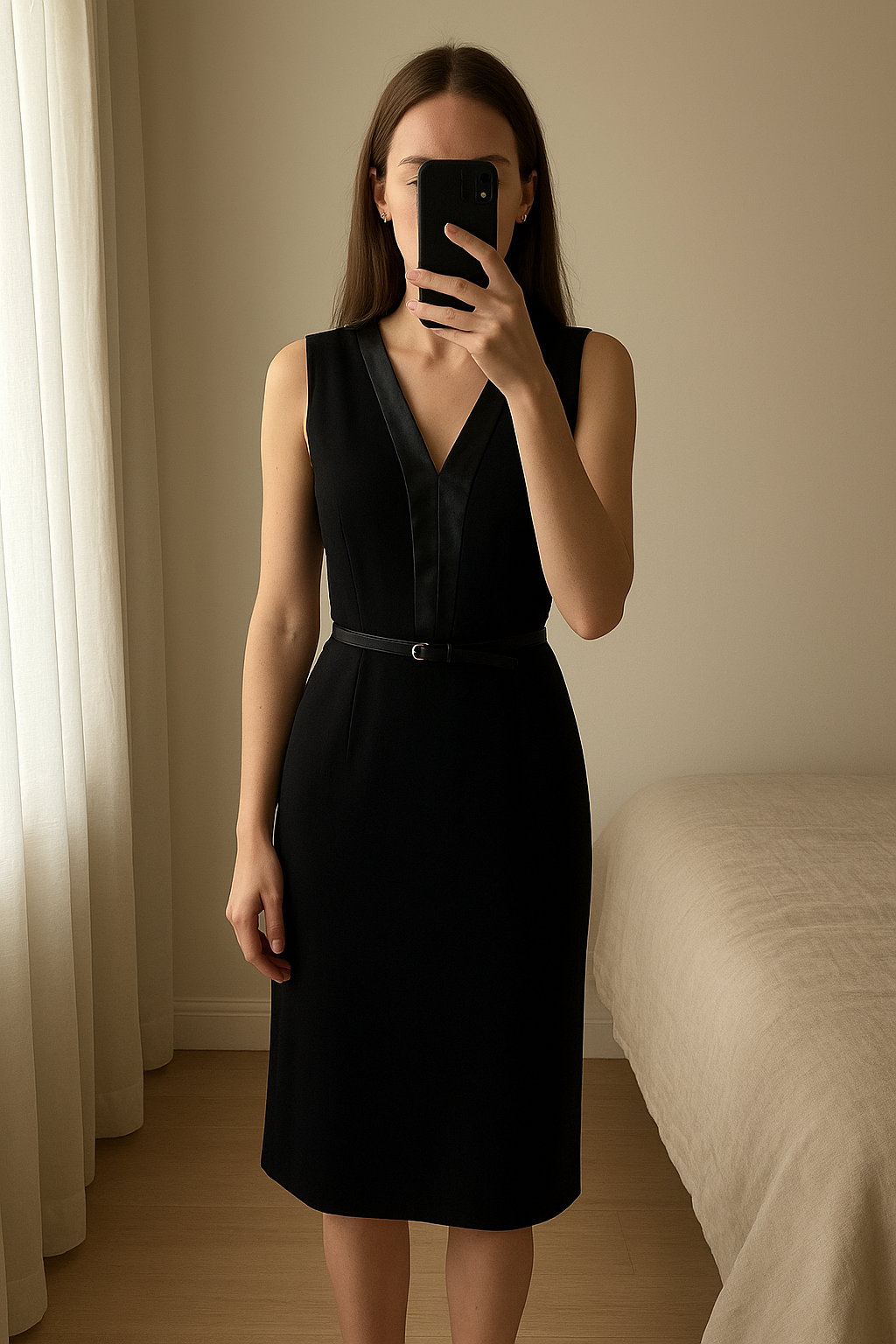 robe business encolure skaï taille 40/42 debout, face à la caméra, dans une chambre à la lumière douce, avec une lumière naturelle filtrant par la fenêtre.