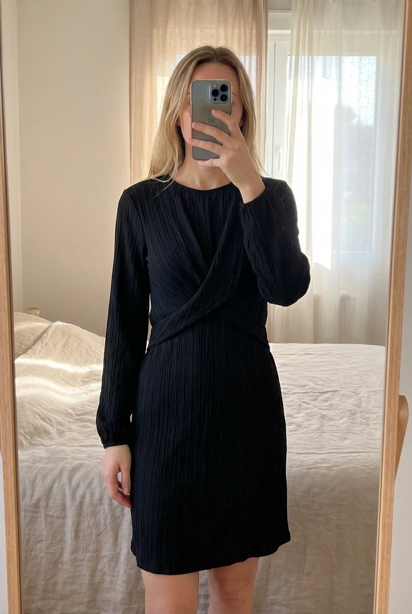 Robe cache cœur debout, face à la caméra, dans une chambre à la lumière douce, avec une lumière naturelle filtrant par la fenêtre.