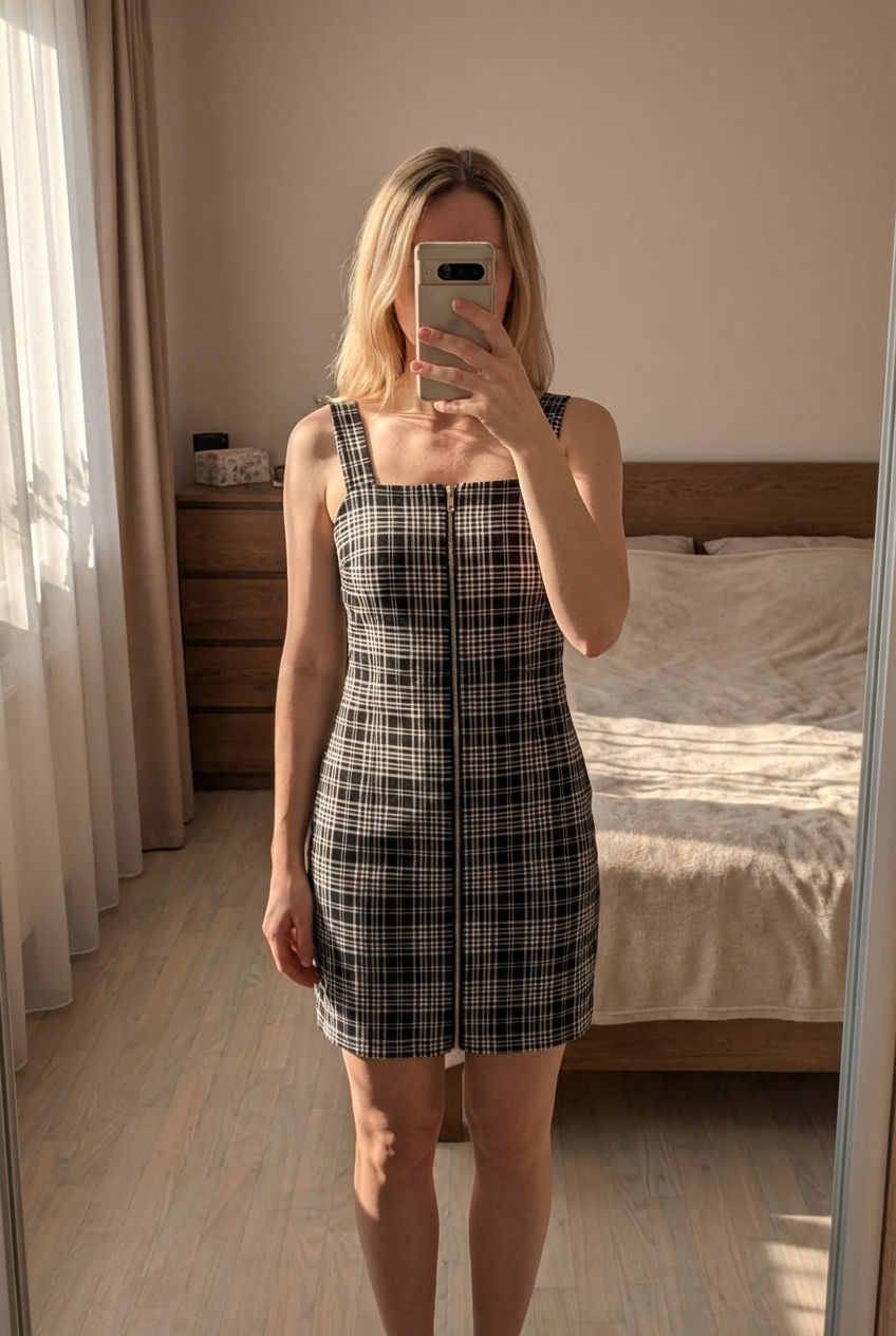 Robe carreaux Pimkie Taille XS debout, face à la caméra, dans une chambre à la lumière douce, avec une lumière naturelle filtrant par la fenêtre.