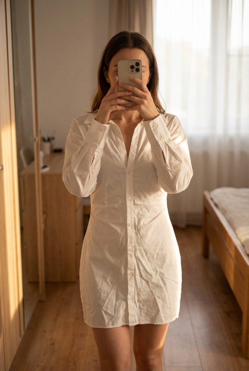 Robe chemise blanche bershka t S debout, face à la caméra, dans une chambre à la lumière douce, avec une lumière naturelle filtrant par la fenêtre.