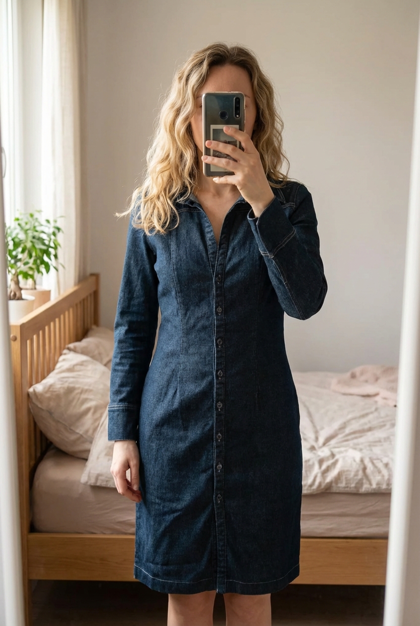 Robe chemise en Jean's - Pimkie debout, face à la caméra, dans une chambre à la lumière douce, avec une lumière naturelle filtrant par la fenêtre.