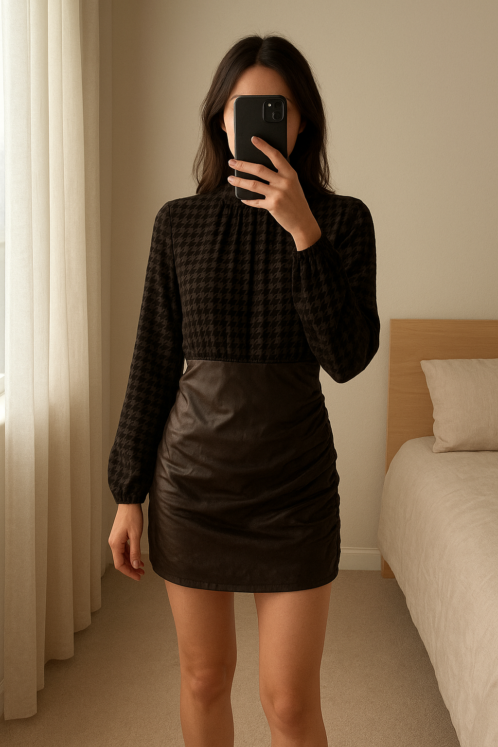 Robe chic simili-cuir Taille XS debout, face à la caméra, dans une chambre à la lumière douce, avec une lumière naturelle filtrant par la fenêtre.