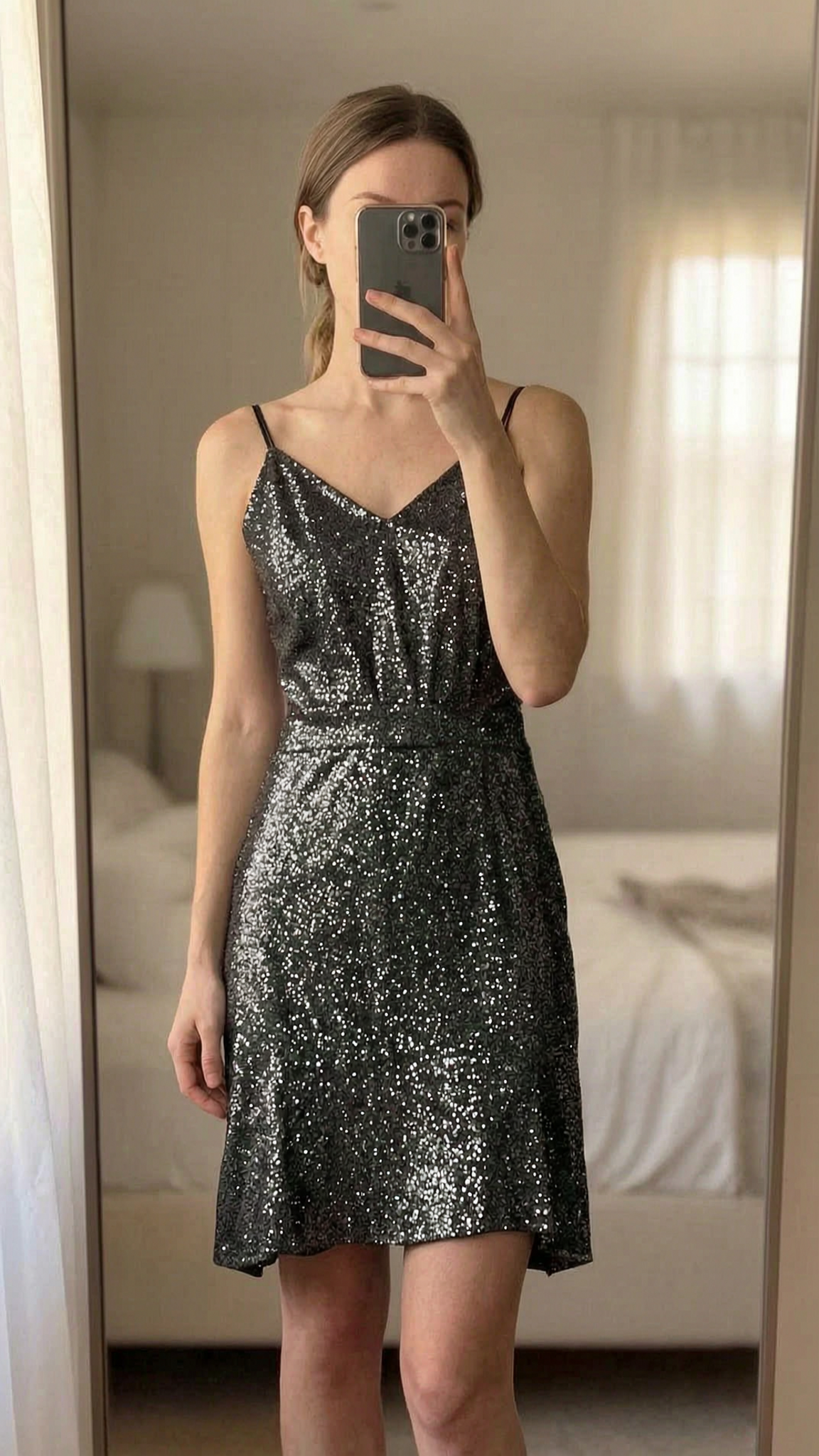 Robe courte à paillette debout, face à la caméra, dans une chambre à la lumière douce, avec une lumière naturelle filtrant par la fenêtre.