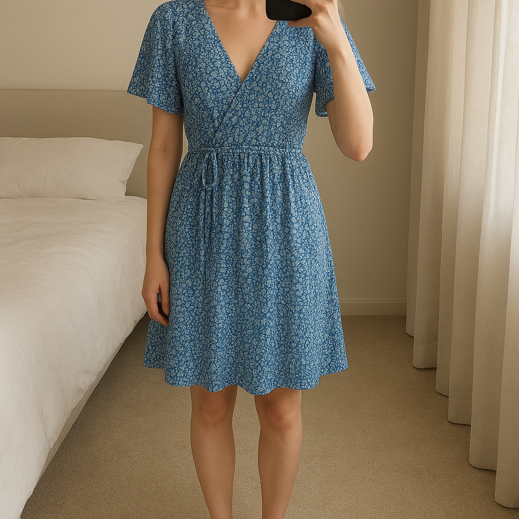 Robe d’été debout, face à la caméra, dans une chambre à la lumière douce, avec une lumière naturelle filtrant par la fenêtre.