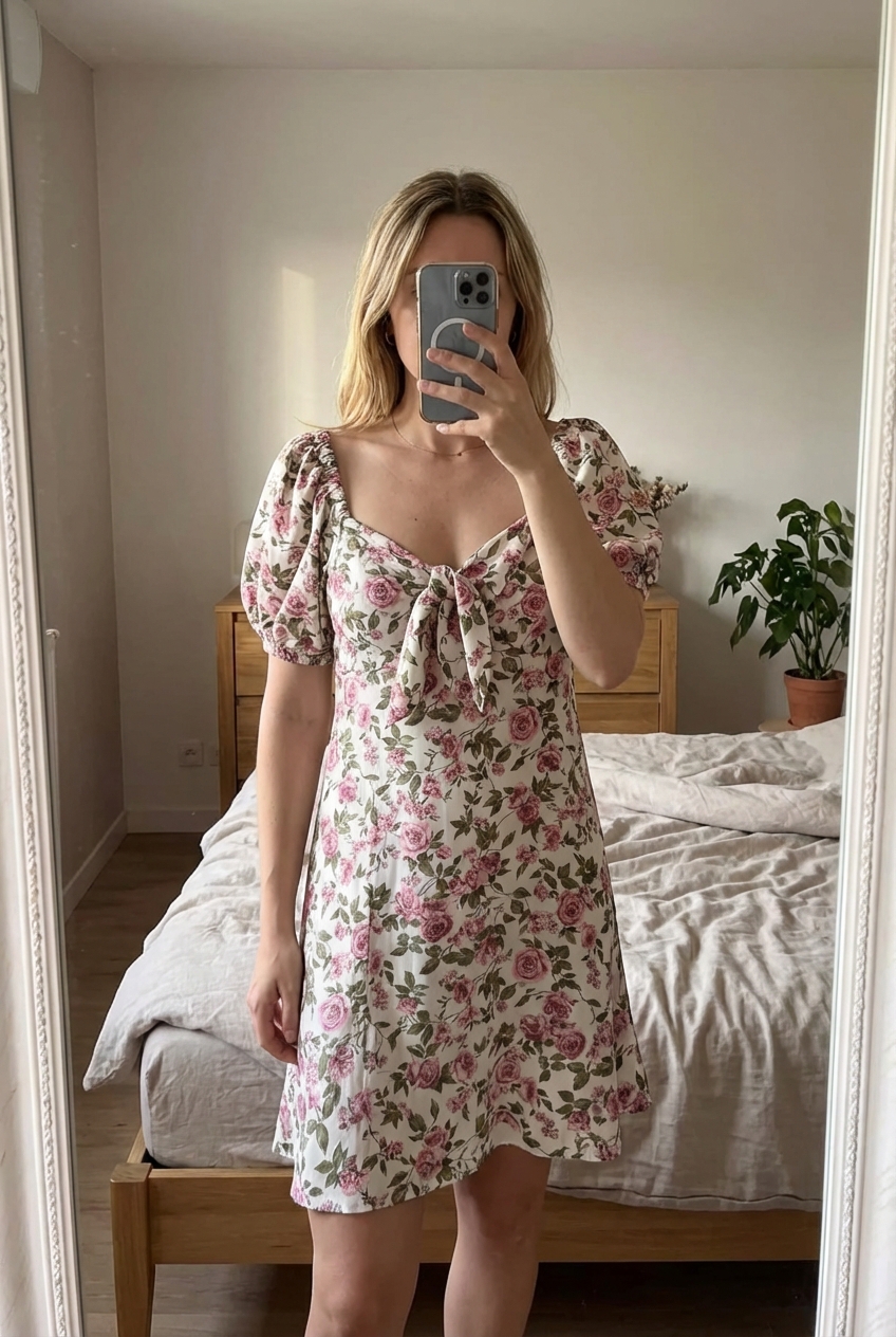 Robe d’été debout, face à la caméra, dans une chambre à la lumière douce, avec une lumière naturelle filtrant par la fenêtre.