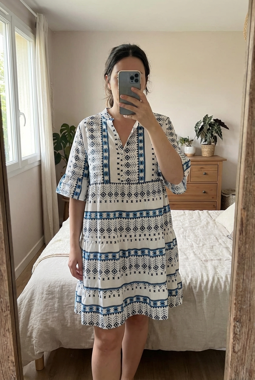 Robe d’été debout, face à la caméra, dans une chambre à la lumière douce, avec une lumière naturelle filtrant par la fenêtre.
