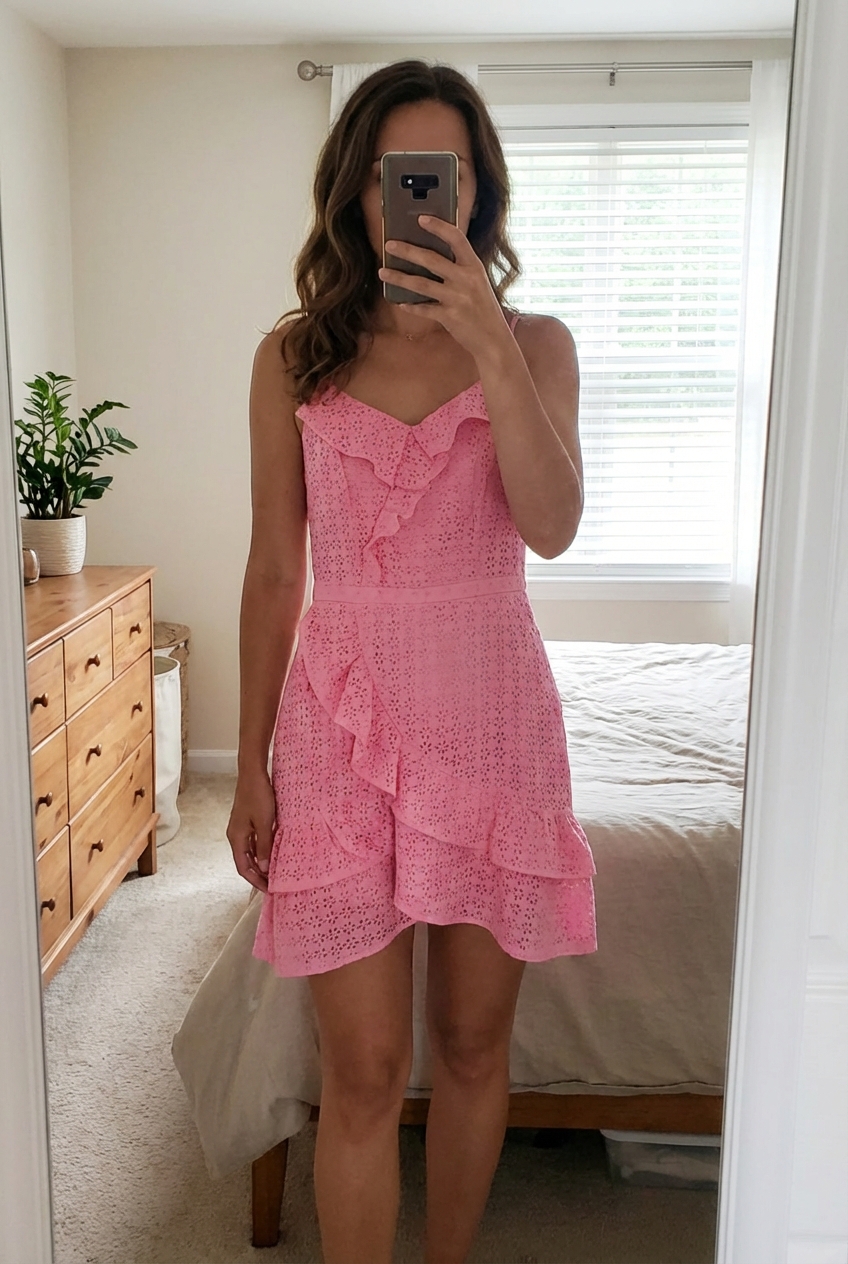 Une personne en Robe d'Été Rose Nafnaf debout, face à la caméra, dans une chambre à la lumière douce, avec une lumière naturelle filtrant par la fenêtre.