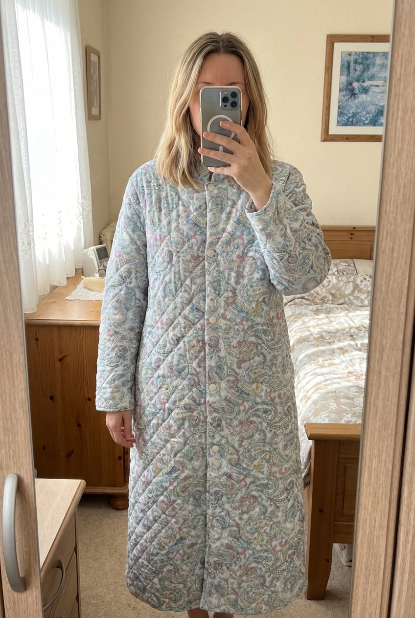 Robe de chambre debout, face à la caméra, dans une chambre à la lumière douce, avec une lumière naturelle filtrant par la fenêtre.