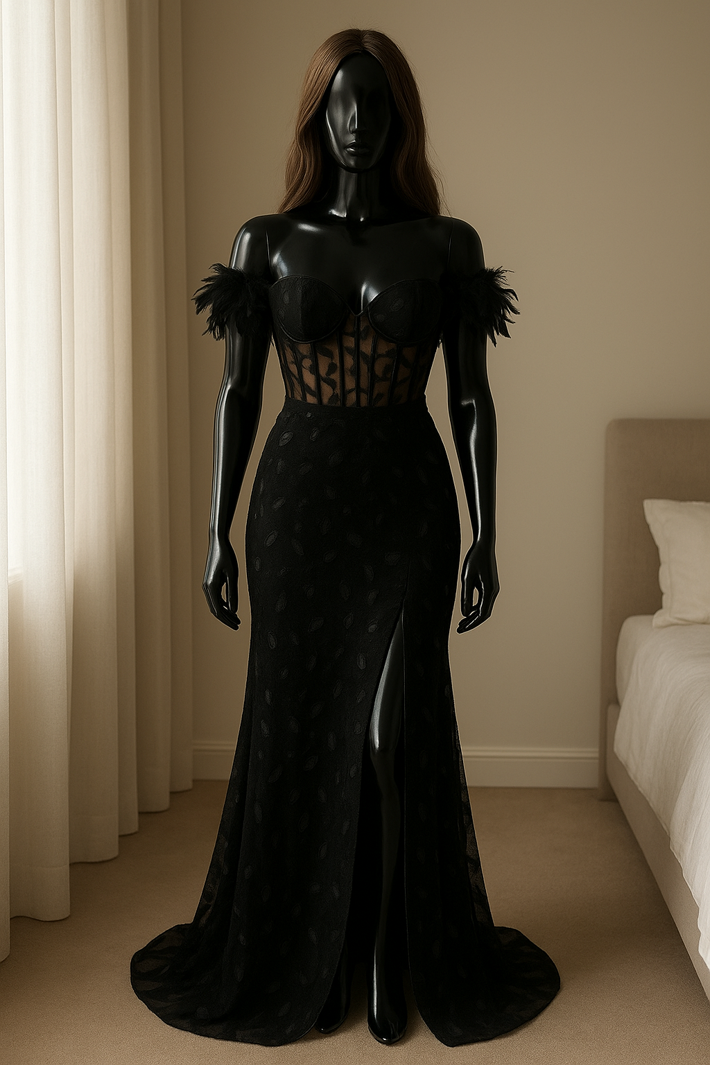 un mannequin noir brillant en plastique, sans traits du visage en Robe de soirée debout, face à la caméra, dans une chambre à la lumière douce, avec une lumière naturelle filtrant par la fenêtre.