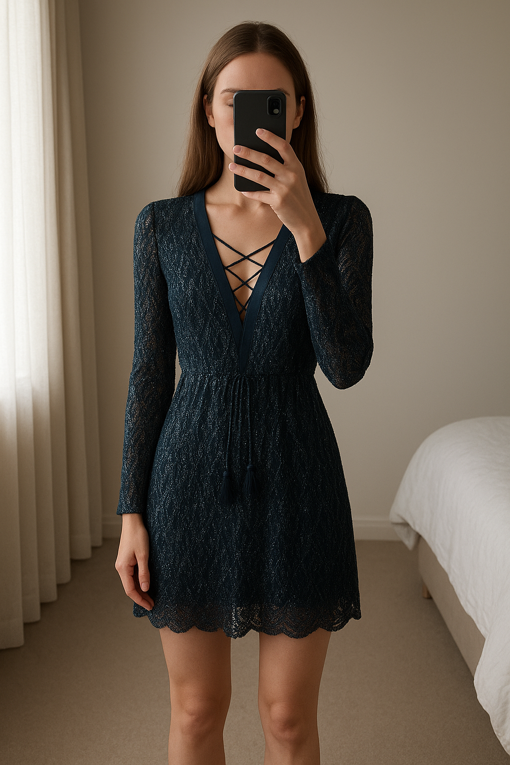 Robe de soirée Morgan debout, face à la caméra, dans une chambre à la lumière douce, avec une lumière naturelle filtrant par la fenêtre.