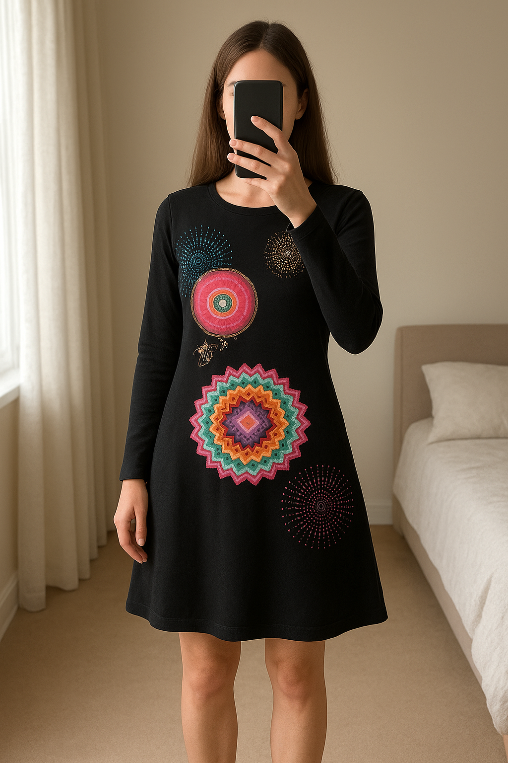 Robe desigual 5/6 ans debout, face à la caméra, dans une chambre à la lumière douce, avec une lumière naturelle filtrant par la fenêtre.