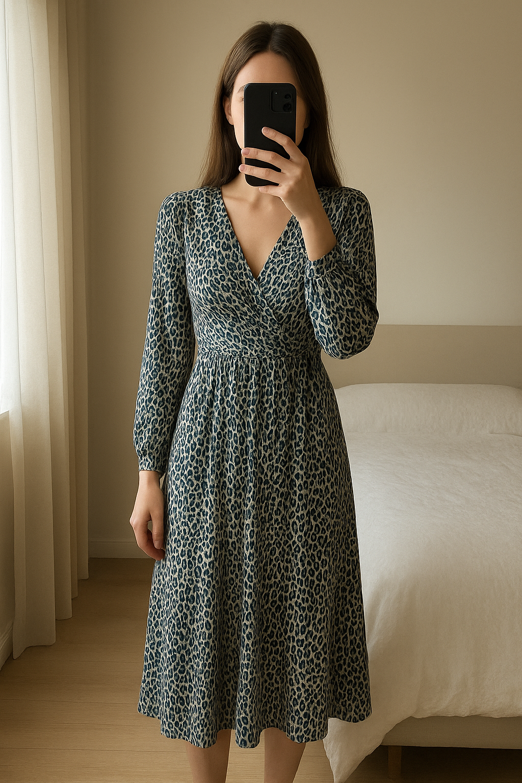 robe effet leopart bleue debout, face à la caméra, dans une chambre à la lumière douce, avec une lumière naturelle filtrant par la fenêtre.