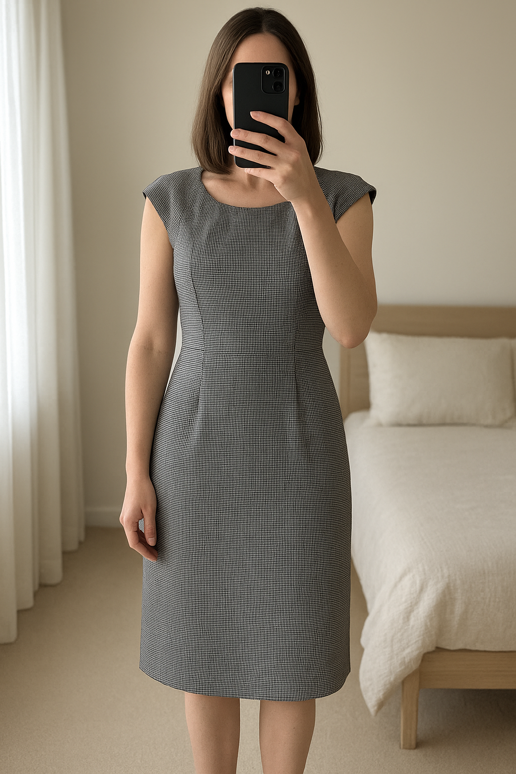Robe en Acrylique 40 Gris debout, face à la caméra, dans une chambre à la lumière douce, avec une lumière naturelle filtrant par la fenêtre.
