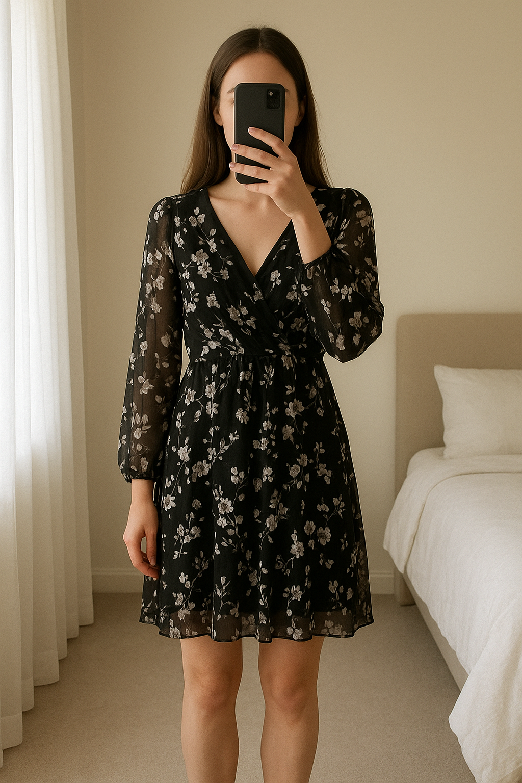 Robe fête noire argentée fleurie Taille 40 debout, face à la caméra, dans une chambre à la lumière douce, avec une lumière naturelle filtrant par la fenêtre.