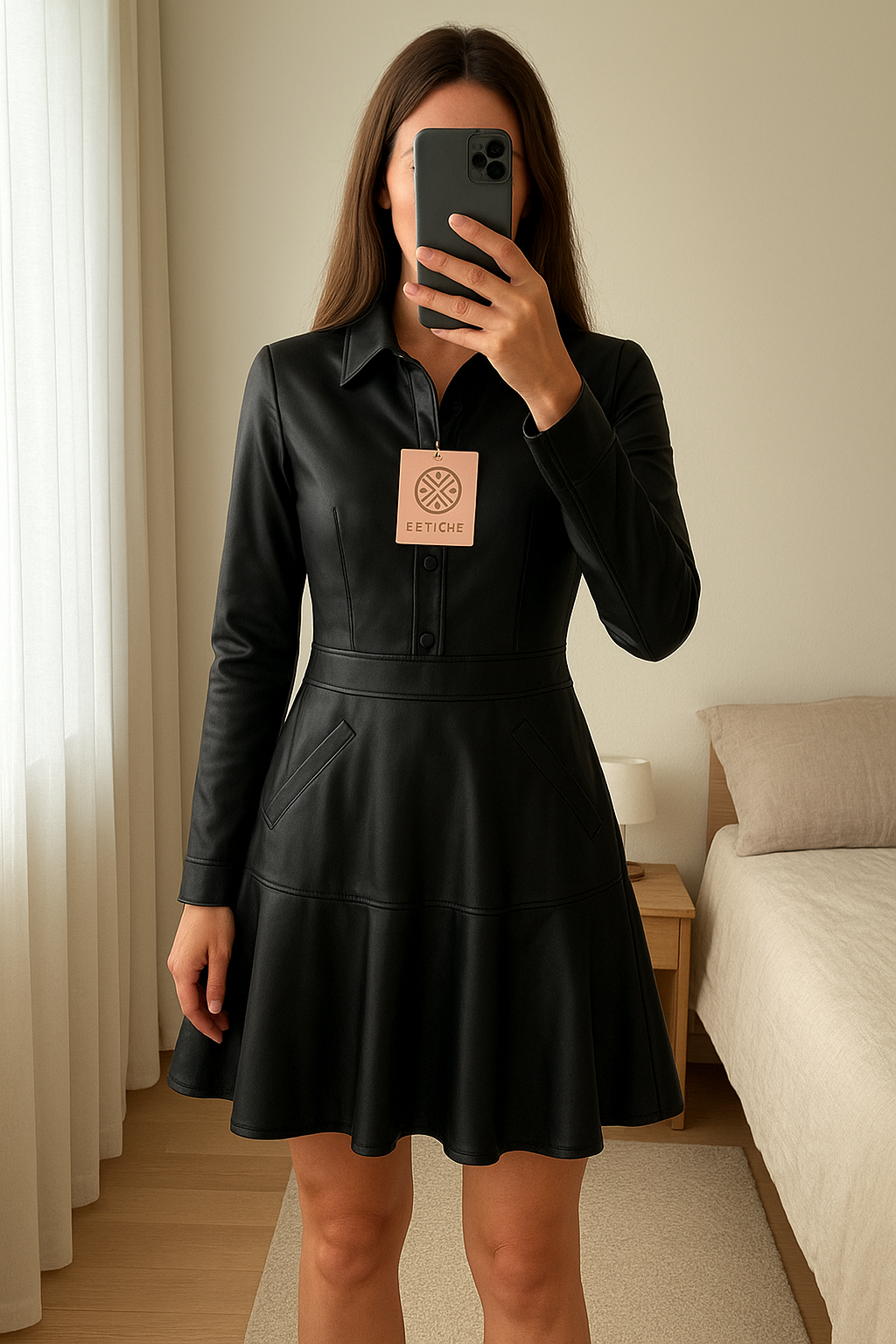 Robe femme 👗 M Fétiche Suances sexy élégante fashion debout, face à la caméra, dans une chambre à la lumière douce, avec une lumière naturelle filtrant par la fenêtre.