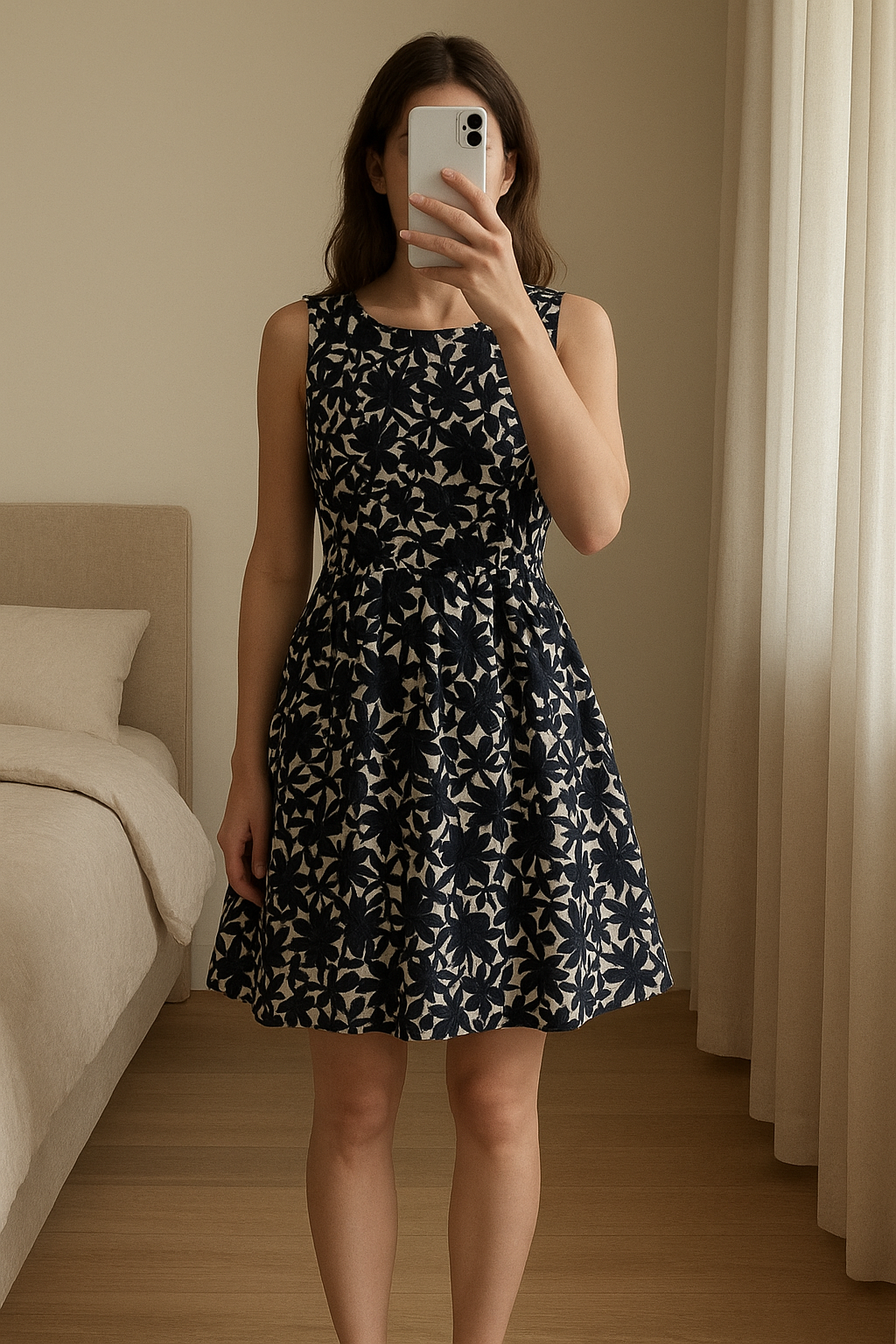 Robe femme à motifs - Abito donna M in piedi, rivolto verso la fotocamera, in una camera da letto con luce soffusa e luce naturale che filtra dalla finestra.