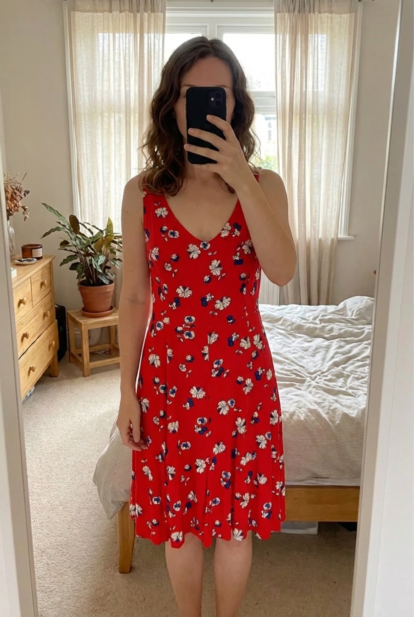 Robe à fleurs debout, face à la caméra, dans une chambre à la lumière douce, avec une lumière naturelle filtrant par la fenêtre.