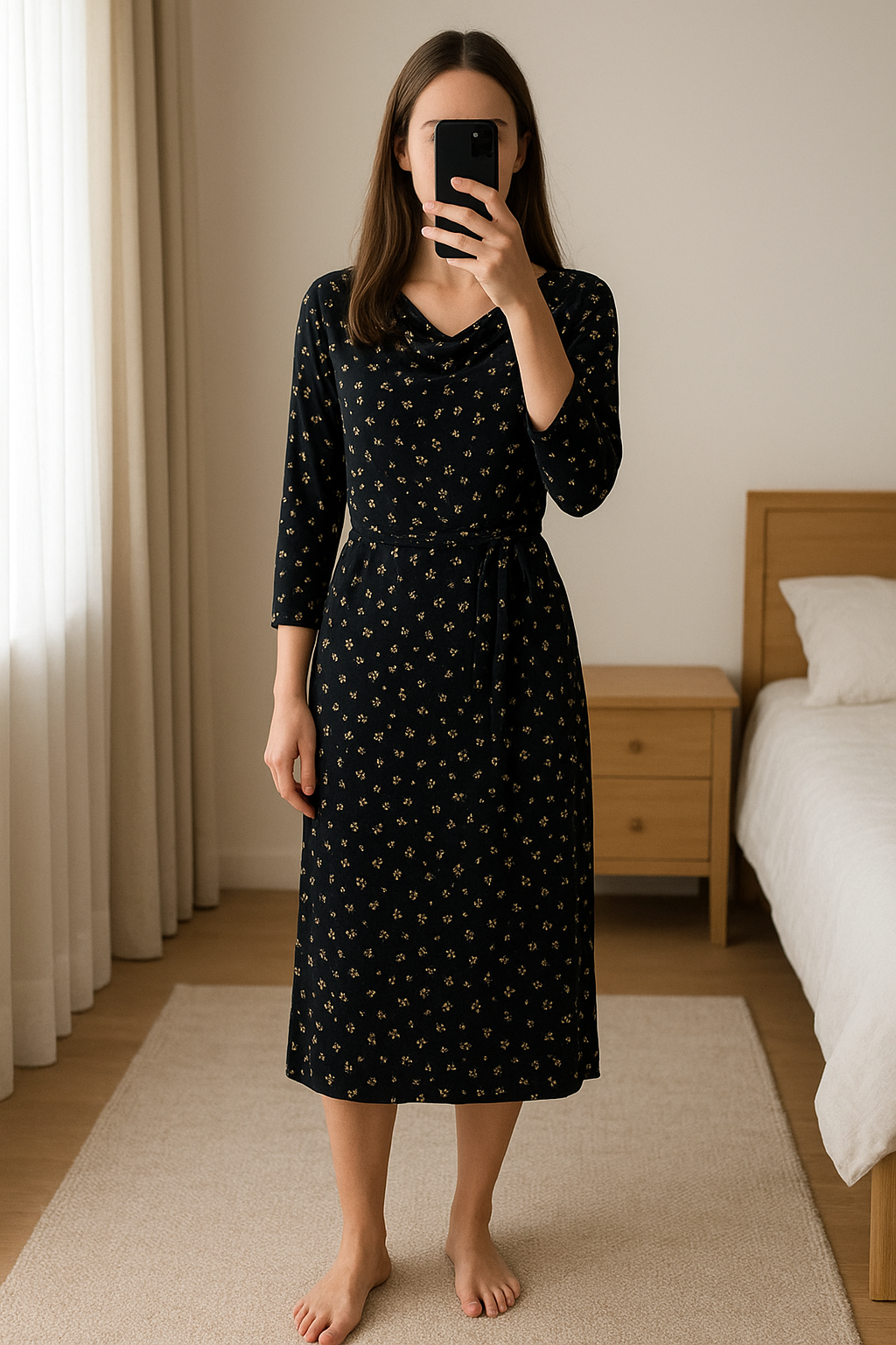 Robe fluide debout, face à la caméra, dans une chambre à la lumière douce, avec une lumière naturelle filtrant par la fenêtre.