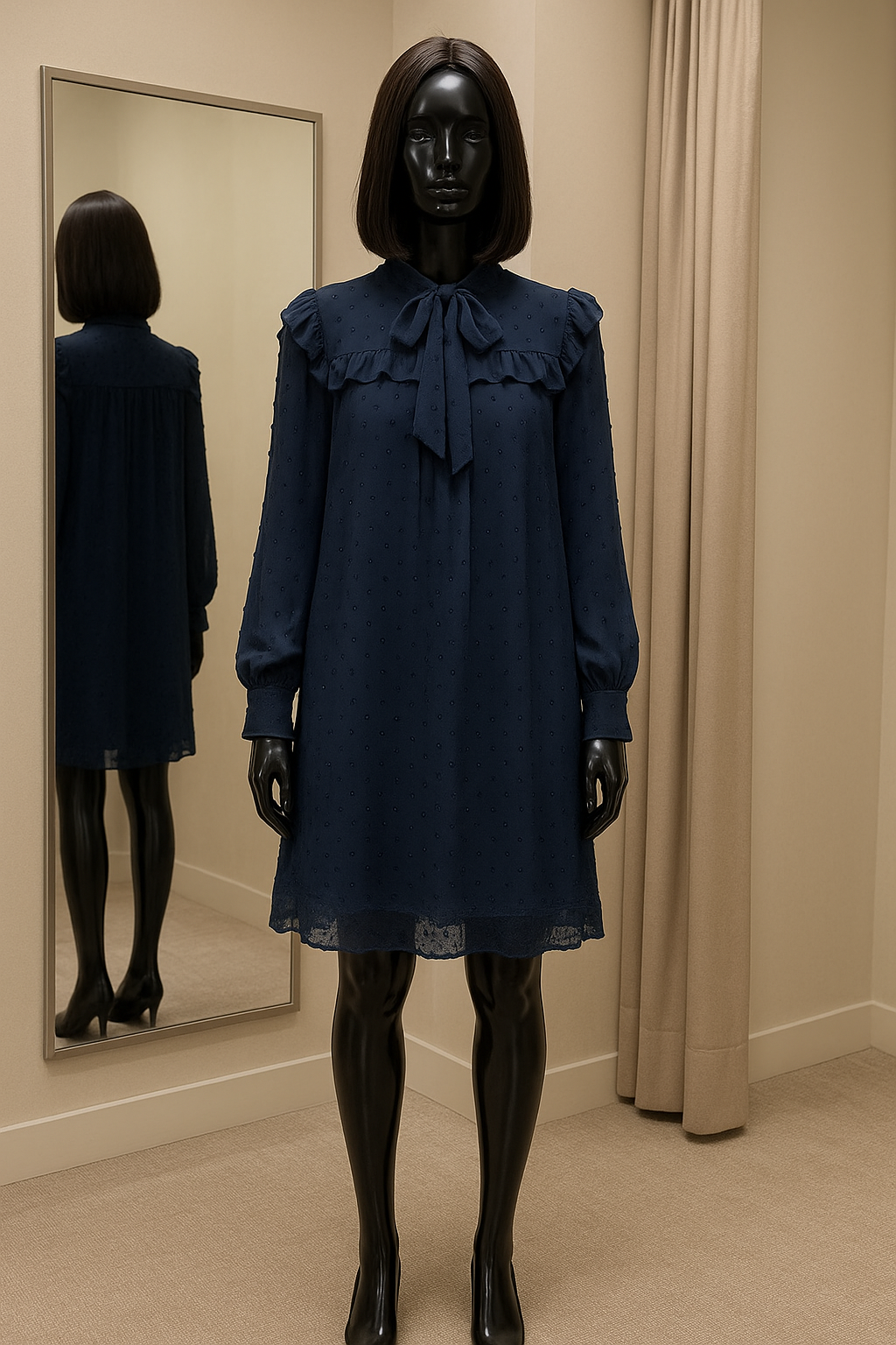 un mannequin noir brillant en plastique, sans traits du visage en robe grace &Mila debout, face à la caméra, avec une silhouette fine, dans une cabine d’essayage de style boutique avec un miroir et une décoration neutre.