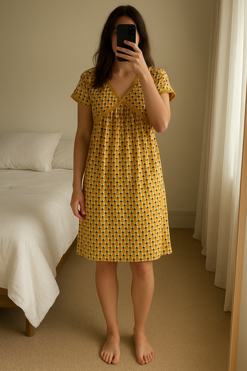 robe graphique jaune debout, face à la caméra, dans une chambre à la lumière douce, avec une lumière naturelle filtrant par la fenêtre.
