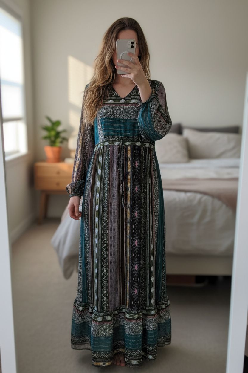 Robe hippie debout, face à la caméra, dans une chambre à la lumière douce, avec une lumière naturelle filtrant par la fenêtre.