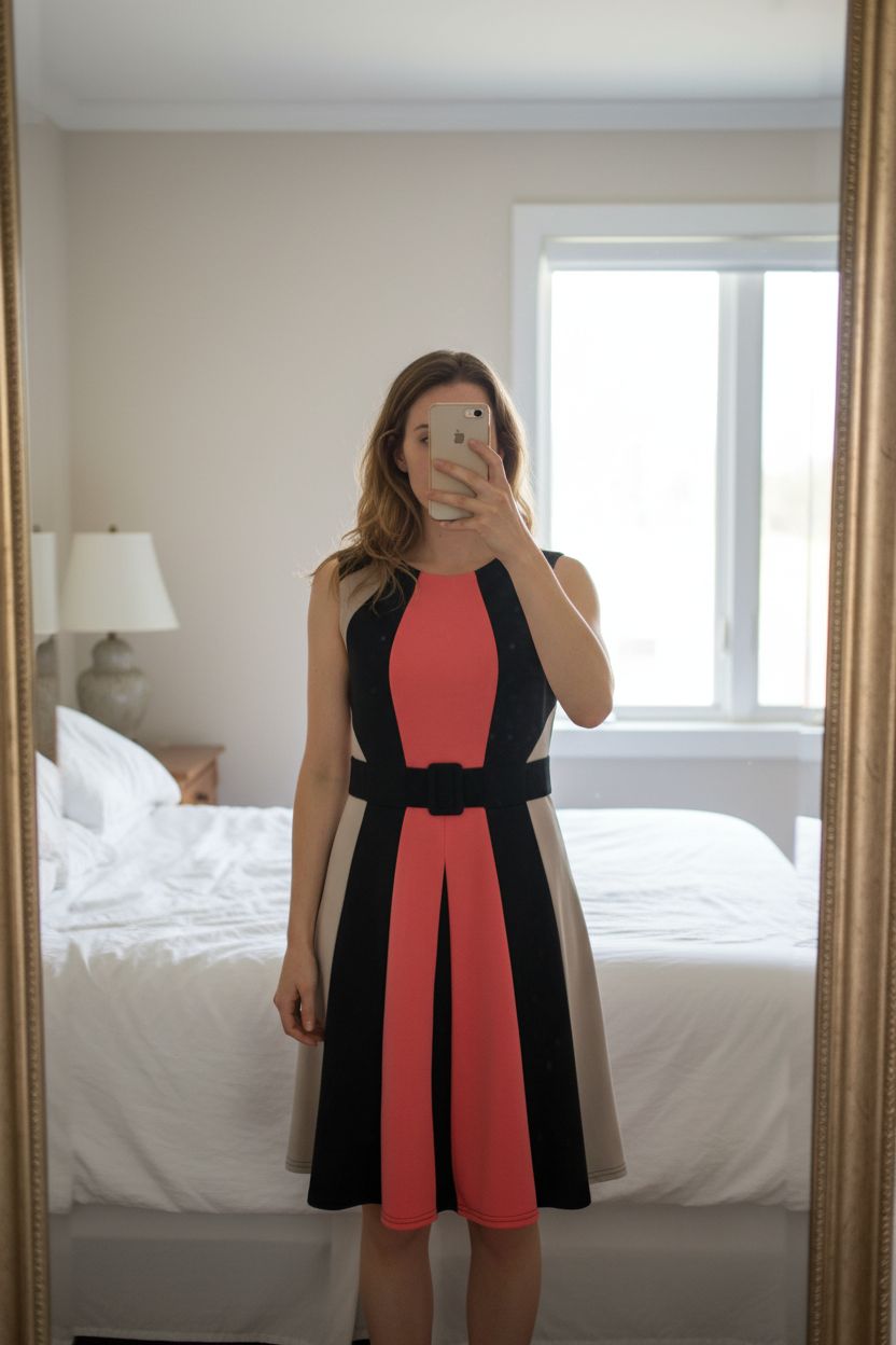 Une personne en Robe jus d'orange Paris M Vintage debout, face à la caméra, dans une chambre à la lumière douce, avec une lumière naturelle filtrant par la fenêtre.