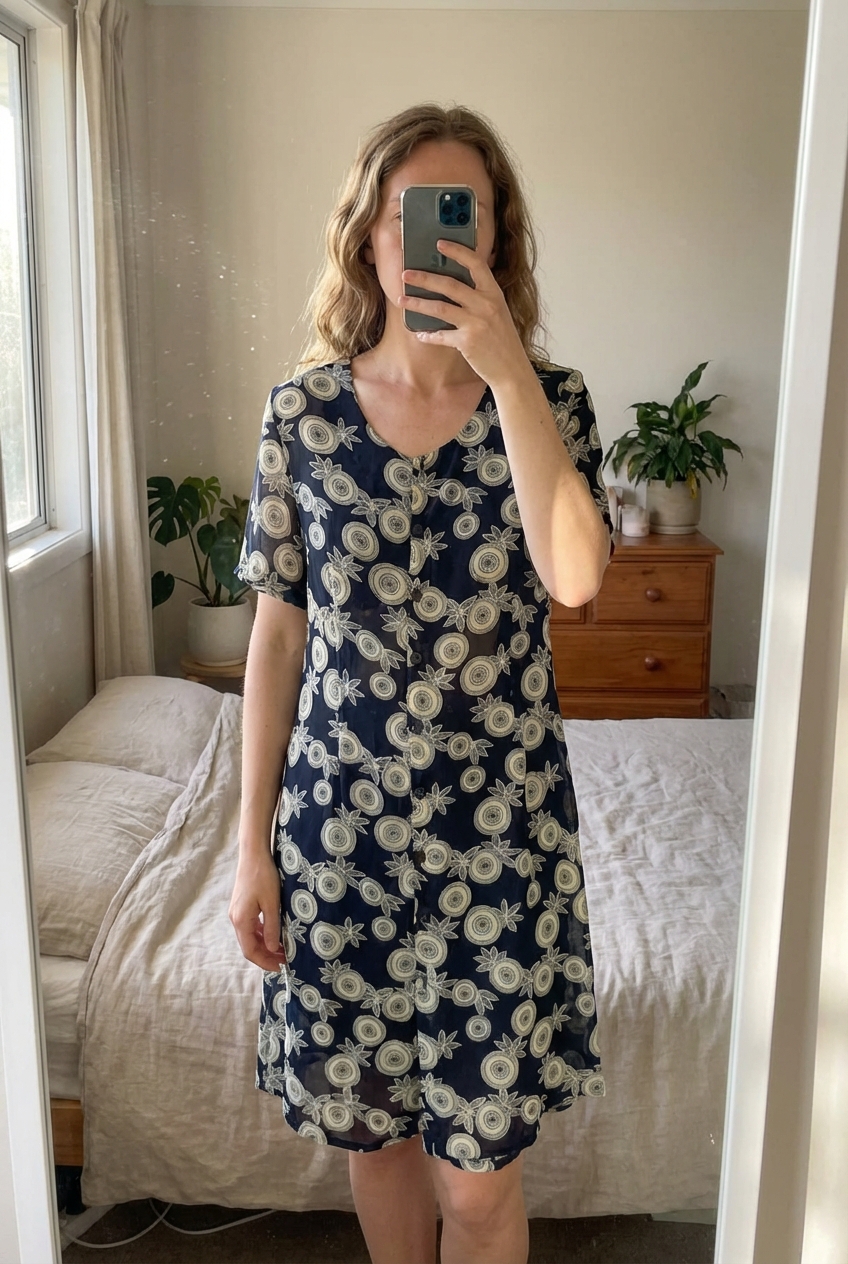 Robe lintai taille xl debout, face à la caméra, dans une chambre à la lumière douce, avec une lumière naturelle filtrant par la fenêtre.