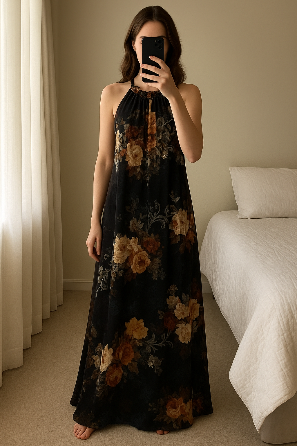 Robe longue debout, face à la caméra, dans une chambre à la lumière douce, avec une lumière naturelle filtrant par la fenêtre.